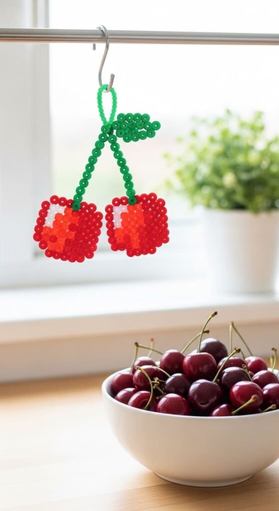 Each cherry pair uses about 40 beads. The connected design stays beginner-friendly. The thin stems need watchful ironing.