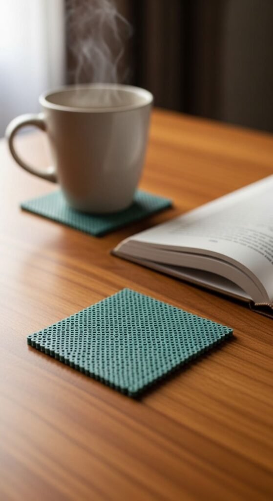 Make sets of four coasters in matching colors. Earth tones like terracotta, sage, or cream feel modern. Each set costs about three dollars in materials.