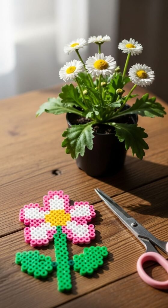 Pink petals with yellow centers feel classic. White petals with yellow centers mimic real daisies. Each petal uses about three to five beads.
