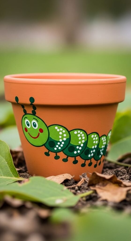 A caterpillar crawling around the pot gives movement without hard drawing.