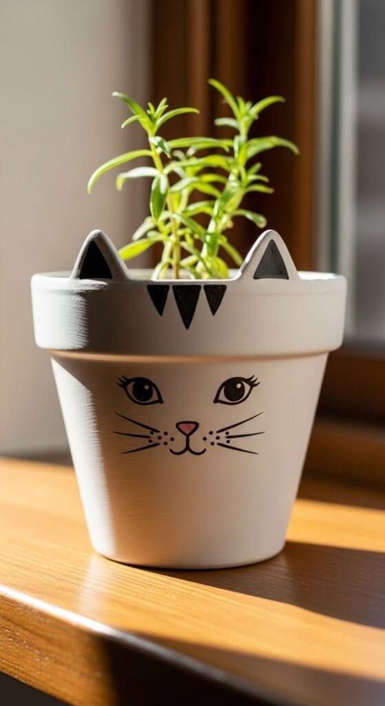 Add triangle ears near the upper edge. If the pot shape makes that hard, paint the ears directly on the front.