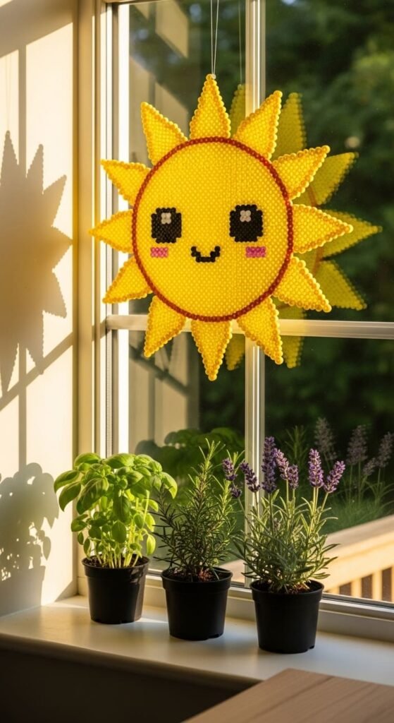 A smiling sun charm spreads joy in any room. Make a yellow circle for the sun’s face. Add pointy ray shapes around the edges.