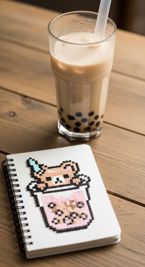 A boba bear combines two kawaii loves into one charm. Make a tall bubble tea cup shape with pastel pink or beige beads. Add tapioca pearls at the bottom in dark brown.