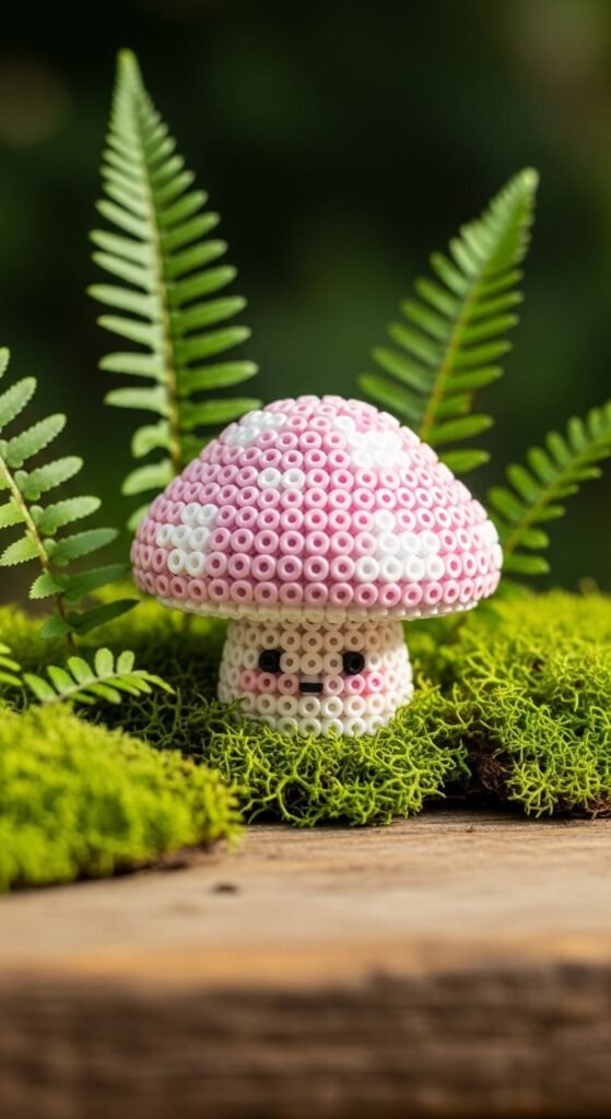 This project teaches you to add patterns within shapes through bead placement. The skill helps with polka dot designs, animal patterns, or any spotted or striped element. Pastel mushrooms also work as keychains, pins, or pendant necklaces for whimsical fashion.