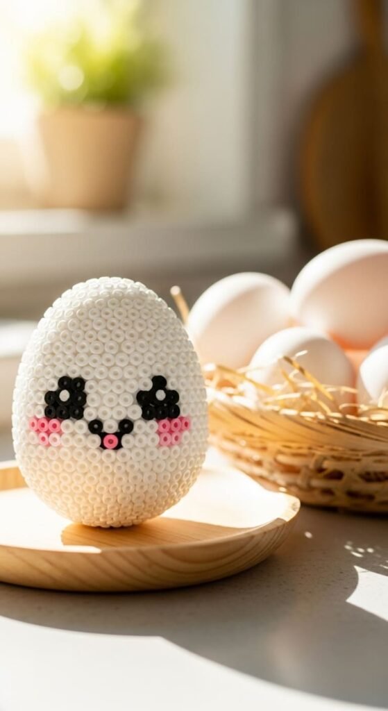 An egg character brings breakfast vibes to kawaii crafts. Make an egg-shaped oval with white or cream beads. Add a face with eyes, mouth, and pink cheek dots.