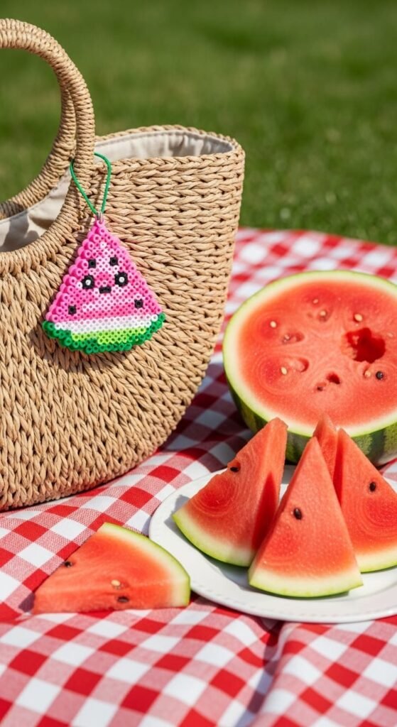This project teaches you to combine multiple bead colors with character details. The skill helps with any fruit, vegetable, or food character design. Smiling watermelons also work as backpack charms, pin-on accessories, or pendant necklaces for summer fashion.