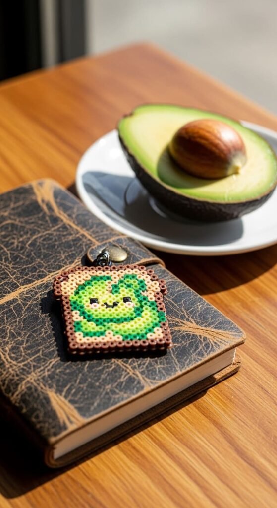 Avocado toast charms feel trendy and playful. Make a brown rectangle for the toast base. Pile green beads on top in an avocado shape.