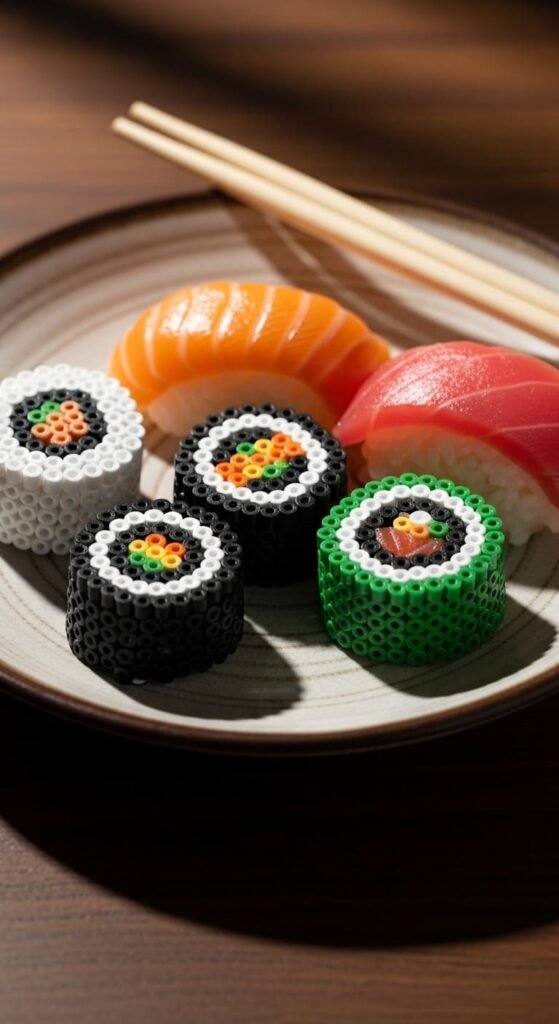 Each sushi roll uses about 40 beads. Iron carefully to keep the layered look defined. The black outline makes the design pop visually.