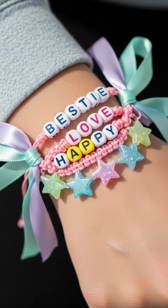 Make matching bracelets for friend groups. Each person gets the same word or coordinating words. The Swiftie aesthetic feels personal and meaningful.