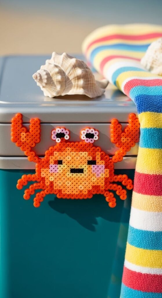 Smiling crab magnets bring summer beach vibes year-round. Use bright orange or red beads for the round body. Add smaller side beads for the four legs and two claws on top.