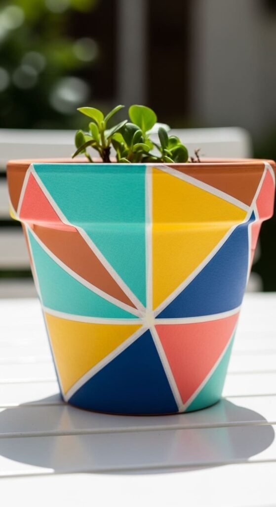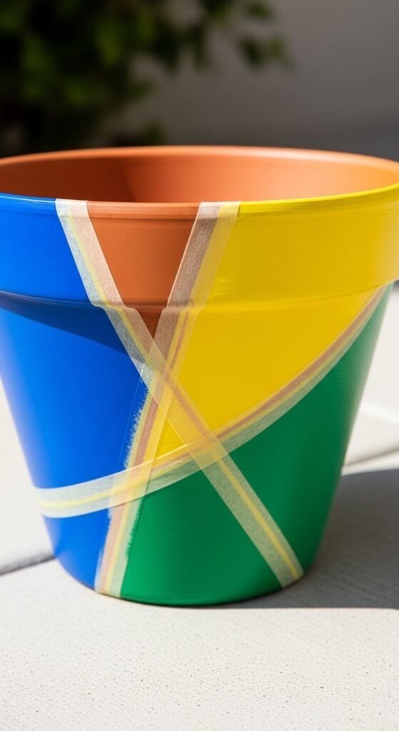 Use masking tape to divide your pot into stripes. Horizontal is safer. Vertical if you want something different. Paint each section in bright colors like red, yellow, blue, and green. Don’t overthink color combinations.