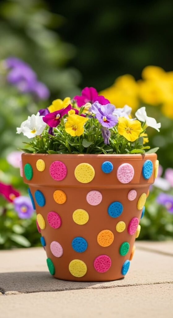 Use a pencil eraser or sponge tip. Dip it into paint and press onto the pot.