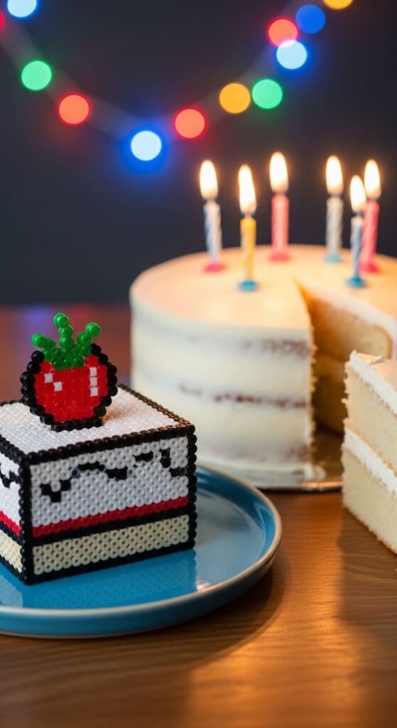This project teaches you to handle layered block designs. The skill helps with all multi-color block patterns. Cake blocks also work as decorative tiles, magnets, or pin-on accessories for game-themed parties.