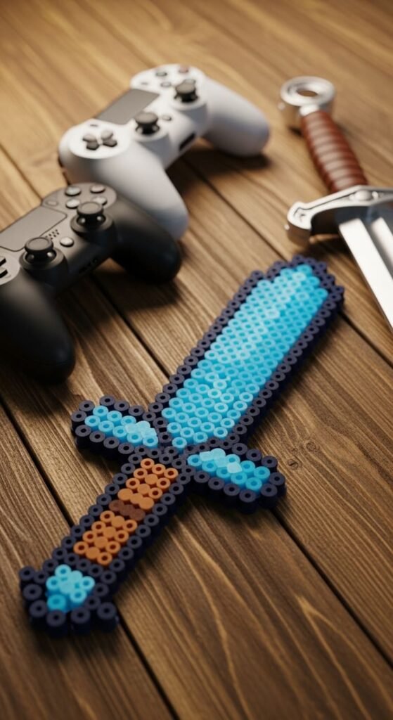 This project teaches you to handle longer angled designs. The skill helps with all weapon and tool patterns. Diamond swords also work as wall art, magnets, or pin-on accessories for serious fans.