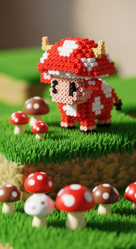 A mooshroom cow combines Minecraft’s strangest farm animals. Make a red cow body with white mushroom caps growing on top. The unique creature feels rare and cute.