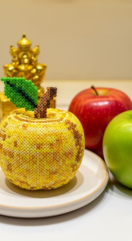 Each apple uses about 50 beads. The gold color suggests rarity and value. Add darker gold accents for shading.