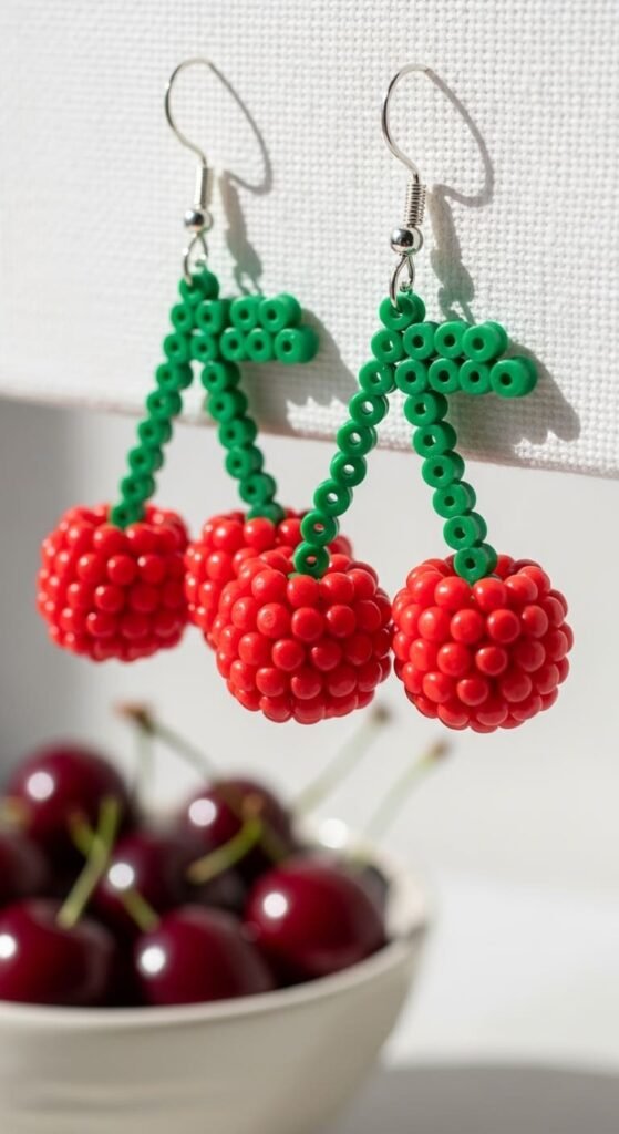 Cherry pair earrings are cute fruit-themed jewelry. Use red beads for the cherries, green for the stems, and a small brown accent for the connection point.