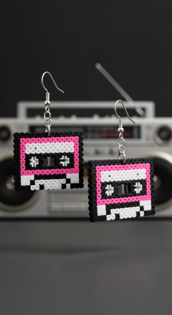 Cassette tape earrings bring 90s retro vibes to your jewelry. Use pink, black, white, or pastel colors for the rectangular tape shape.
