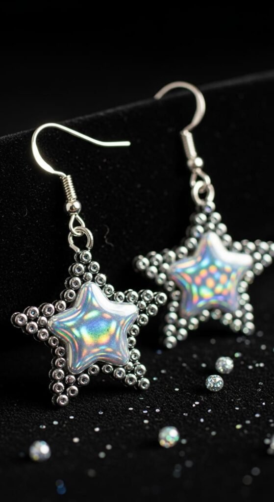 Holographic star earrings add magical sparkle to any outfit. Use special holographic or pearl-finish beads for the star shape.
