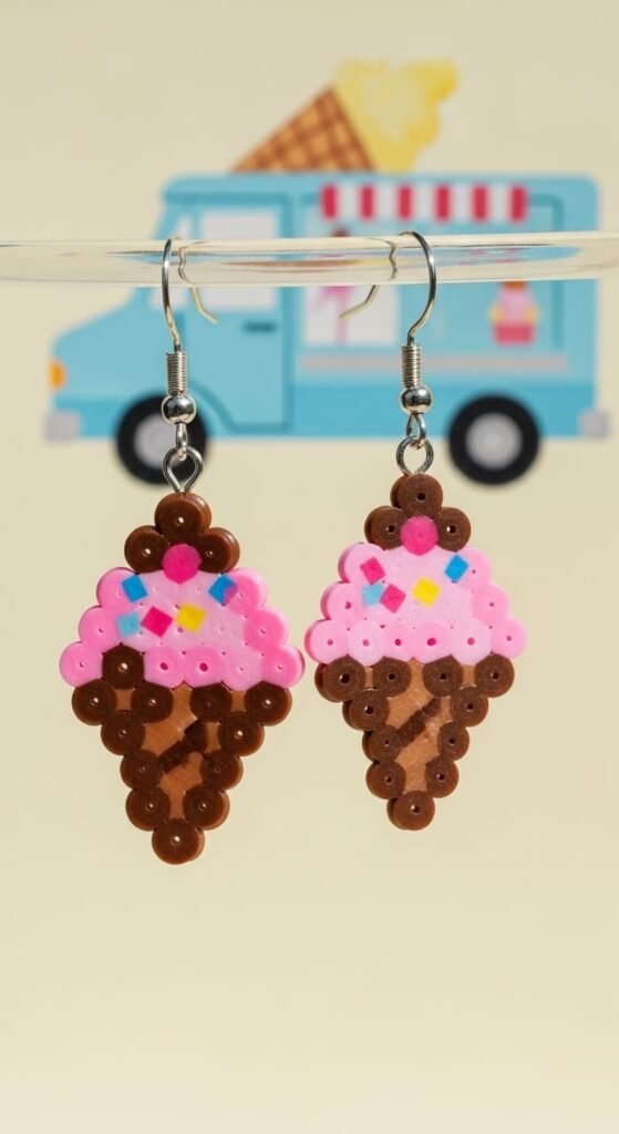 Ice cream cone dangles are summer-perfect Perler bead earrings. Use brown for the waffle cone, pink or white for the ice cream scoop, and small rainbow beads for sprinkles.