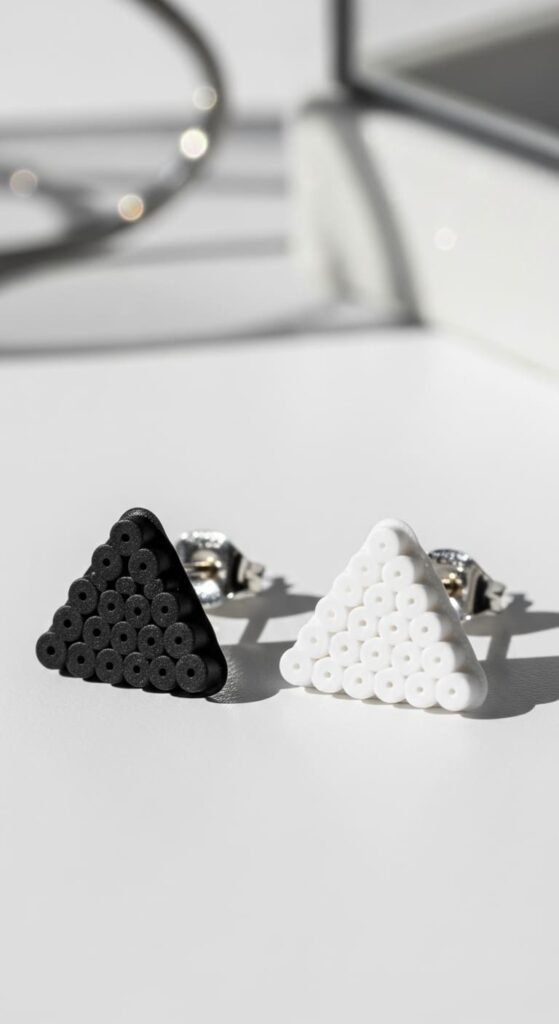 Geometric triangle studs appeal to minimalist style lovers. Use bold colors like black, white, gray, and gold for a modern look.