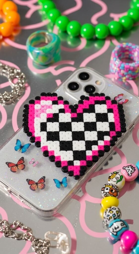 Checkered hearts are everywhere in trendy crafts. Make a heart shape with alternating black and white beads in a checkered pattern. Add hot pink or red accent beads at the center.