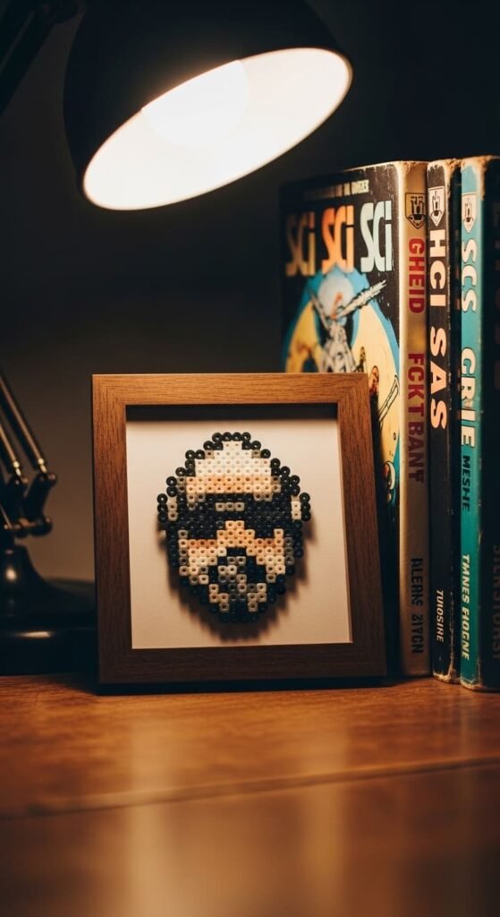 Frame in a small wooden frame for wall art. Coordinate the frame color with the bead palette. The finished piece looks store-bought and curated.