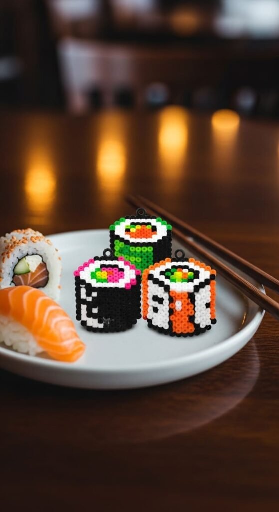 Each sushi piece uses about 40 beads. Iron carefully to keep the round shape and outline. The contrast between black, white, and color stays sharp.