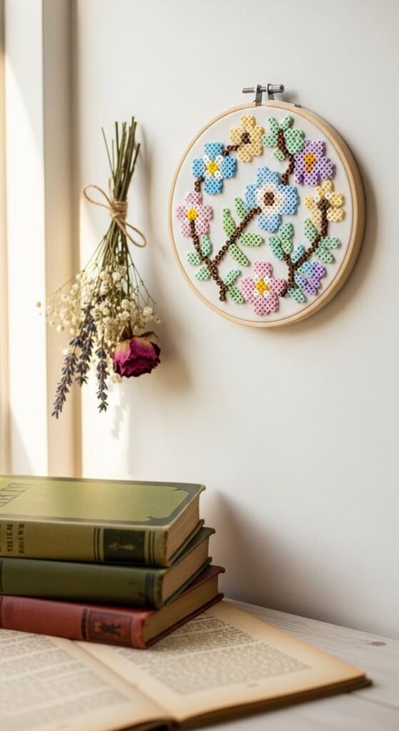 This project teaches you to combine perler beads with traditional craft tools. The skill helps with mixed media projects. Cottagecore floral hoops also work as decor pieces, gift toppers, or seasonal decorations.